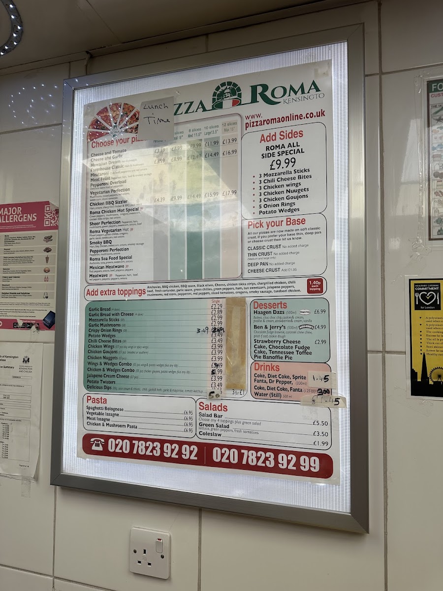 Pizza Roma Kensington offers a variety of dishes that cater to different tastes, from classic pizzas to hearty pastas and indulgent desserts. For pizza lovers, the menu includes options like Cheese and Tomato, Cheese and Garlic, and the meat-loaded Farmhouse Classic and Meat Feast. If you're in the mood for something extra, there are also options to add Garlic Bread, Mozzarella Sticks, and Crispy Onion Rings. The pasta selection includes the classic Spaghetti Bolognese, and the comforting Meat Lasagne and Vegetable Lasagne, along with the creamy Chicken & Mushroom Pasta. For those seeking lighter options, the Salad Bar, Green Salad, and Coleslaw are refreshing choices. If you're craving a sweet treat, you can enjoy indulgent desserts like Haagen Dazs, Ben & Jerry’s ice creams, Strawberry Cheesecake, Chocolate Fudge Cake, or the decadent Tennessee Toffee Pie and Banoffee Pie. The restaurant also offers a range of drinks including Coke, Fanta, Dr Pepper, and Water. For those after a snack, the Chicken Nuggets, Wings & Wedges Combo is a great option, while extra side dishes like Chicken Wings and Chicken Goujons are available to complement your meal. The variety of choices, paired with affordable prices, makes Pizza Roma Kensington a versatile spot for both quick bites and more indulgent dining.